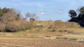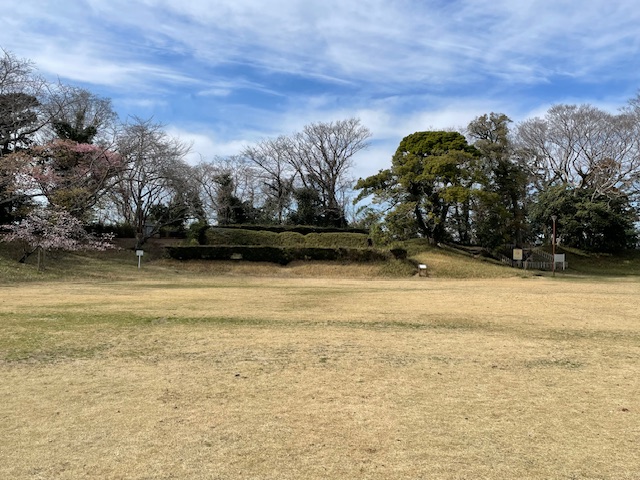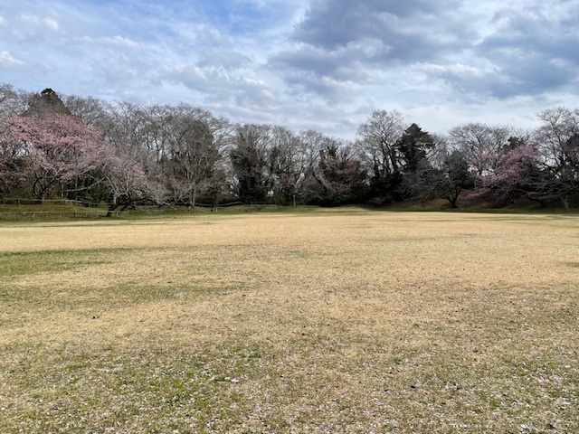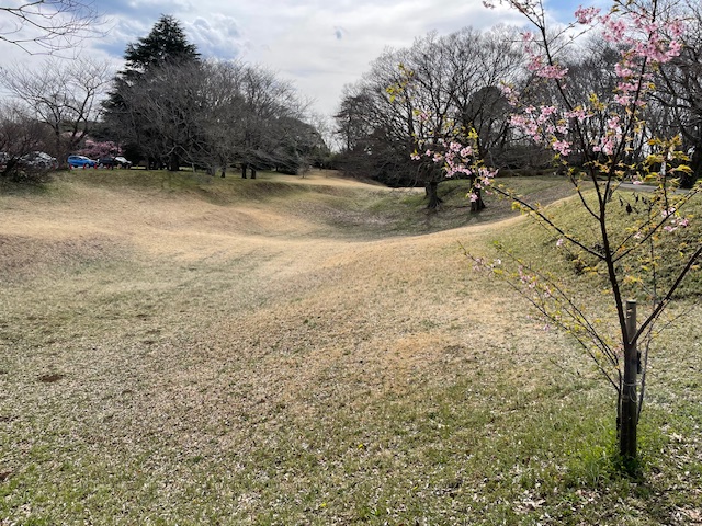 草木があまり伸びていないので、綺麗に形がわかりますね。あまり石材などを使わずに、自然の地形を活かしている様子がわかります。早咲きの桜が咲いていて、美しい風景でした!