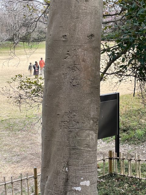 モッコクは、西日本に自生する小きょうぼくで、土井利勝が庭木として植えたと伝えられています。このモッコクには、兵士が落書きした文字があります。