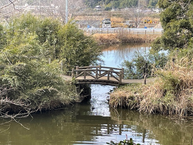 次に、外縁の水堀に向かいました。湿地帯に掘られた水堀が本丸台地を巡り、水堀に守られた南出丸と西出丸があります。本丸側からは、水堀を見ることができました。