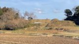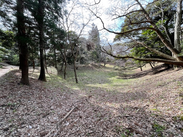 周囲が土塁で囲まれていて、凹んでいるのがわかります。少しわかりにくいかもしれませんが、写真左奥がぐちとなる枡形ますがたになっています。