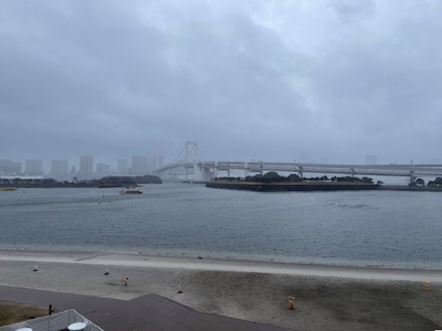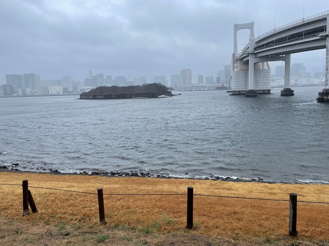ゆりかもめ東京臨海新交通臨海線のお台場海浜公園駅から徒歩で第三台場へ向かいました。当日は、天気が悪く、雨と風が強かった中行ったので、海沿いと言うこともありとても寒かったです。台場の横には、レインボーブリッジが通っていて、駅から10分ほどでレインボープロムナード台場口に着きました。そこからは、陸続きの第三台場を見ることができました。