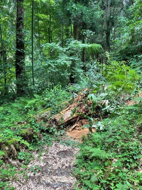 一ノ丸に戻り、二の丸へと向かいました。少し進むと、大木が大雨の影響で倒れていました。
