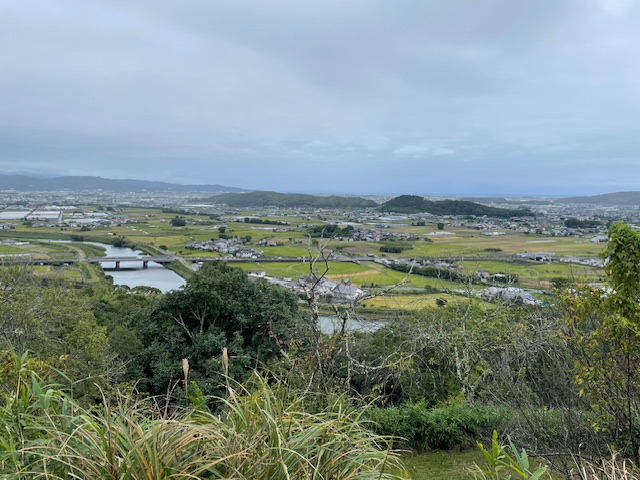 のどかな良い眺めですね!手前に流れているこく川は、城の天然の水堀とされました。見えている景色は南国市郊外の様子で、奥の方には市街地と海が見えます。