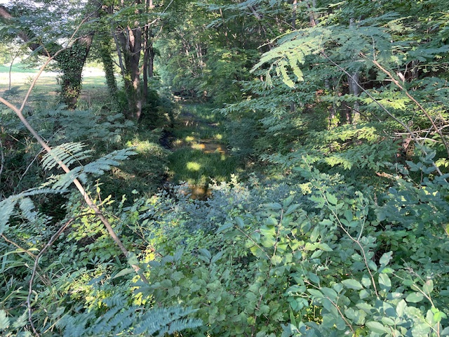 写真左側が丸馬出部分となり、写真中央で湾曲している溝が三日月堀となっています。
