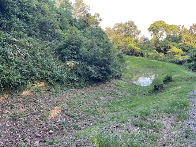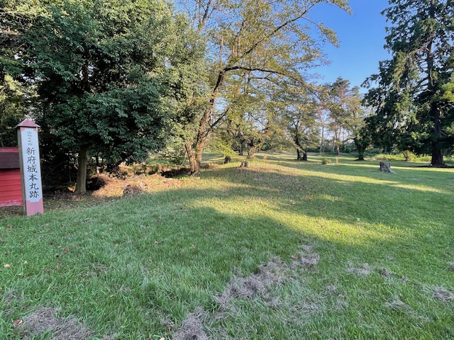 韮崎市民俗資料館から自転車に乗り、25分ほどで新府公園駐車場に着きました。駐車場は城の北東に位置し、そこから西に歩いて新府城の入り口に向かいます。昔は堀であった湿地に沿った道になっていて、道中からは出構が見えます。