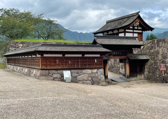 搦手口を守る外枡形門です。手前が一ノ門(高麗門)で奥がニノ門(櫓門)です。昔は、このあたりまで千曲川が接近していたそうです。