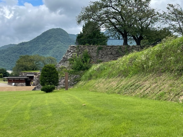 手前の二の丸は土塁で囲まれています。奥の戌亥隅櫓台は野面積の石垣です。