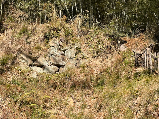 登山口には早速、石垣が見えました。大手口に使用されているので、登城してきた者に権力を示す「見せるための石垣」であったと考えられます。登山口は、大手道の入り口になっていて、大手道の随所に石垣を見ることができます。