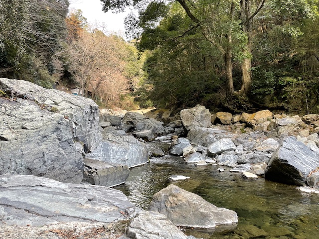 美しい渓谷ですね!写真右が城郭側で、この川が天然の水堀のような役割になっています。こんな綺麗な川が城の守りの役割だなんて驚きですね。