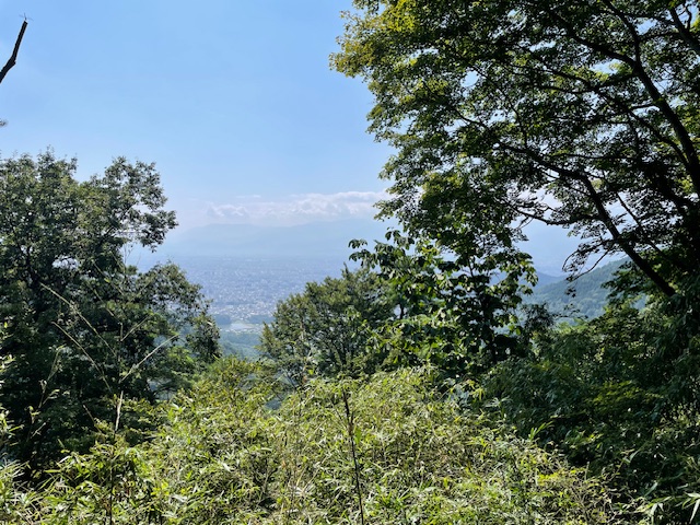 木が鬱蒼としていますが、奥の方には山梨県内の山々が見えて景色は良かったです。要害山城から2.5kmほど離れている躑躅ヶ崎館も見ることができます。