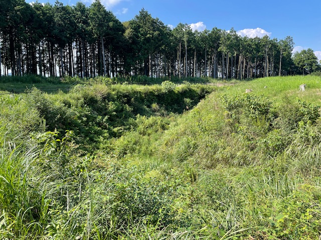 草が生い茂ってわかりづらいかもしれませんが、丸馬出となっています。写真右側が馬出部分となり、写真中央で湾曲している溝が三日月堀となっています。