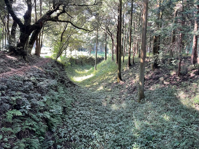 城跡入り口から、いくつかの堀がある大手曲輪を歩きました。堀を眺めながら進むと、二の曲輪中馬出が見えてきます。